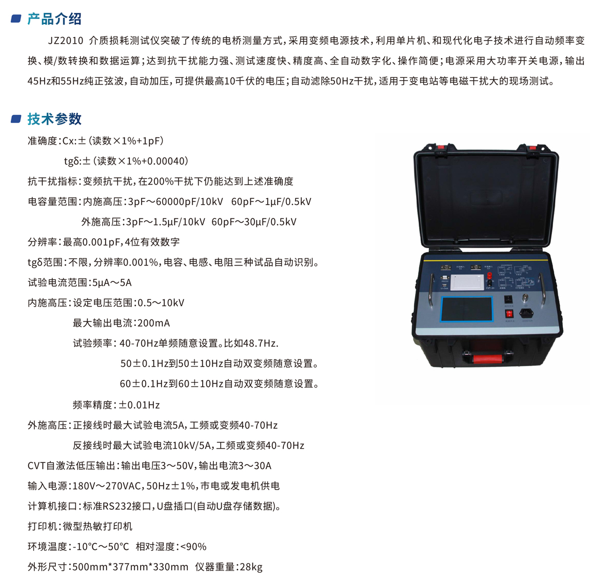 JZ2010介質(zhì)損耗測(cè)試儀突破了傳統(tǒng)的電橋測(cè)量方式,采用變頻電源技術(shù),利用單片機(jī)、和現(xiàn)代化電子技術(shù)進(jìn)行自動(dòng)頻率變