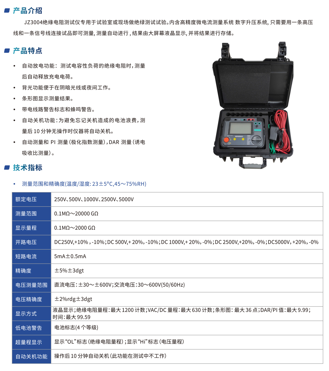 JZ3004絕綠電阻測(cè)試儀專用于試驗(yàn)室或現(xiàn)場(chǎng)做絕綠測(cè)試試驗(yàn)。內(nèi)含高精度微電流測(cè)量系統(tǒng)數(shù)字升壓系統(tǒng),只需要用一條高壓